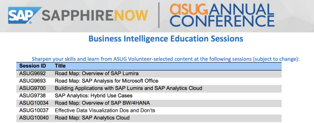 The ASUG BI Community has a great slate of BI and Analytics sessions ready for you to add to your ASUG Annual Conference/Sapphire now agenda! Our intrepid Community Facilitator, Tammy Powlas, has put together a great addition to your information arsenal. Remember, these sessions have been picked by the ASUG BI Volunteer team to try and cover the questions that attendees have been asking about.