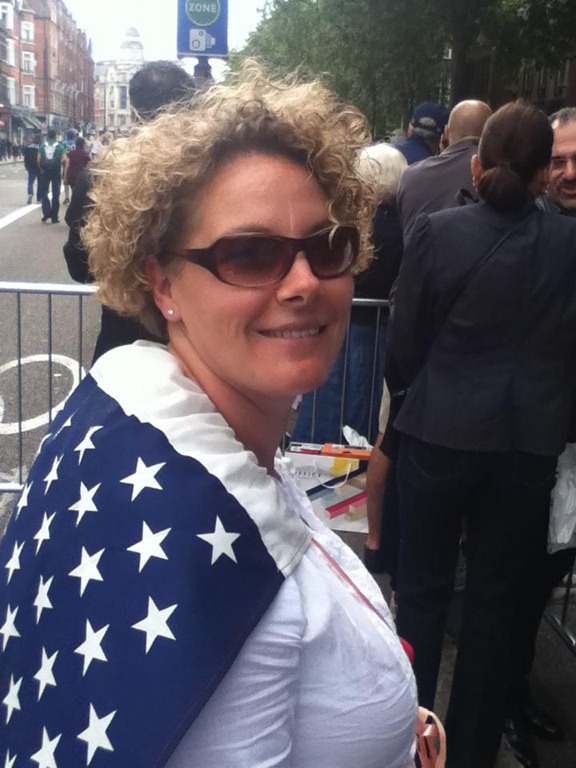 After the event, we walked home and grabbed a really nice lunch (sandwiches & salads) at a neat little cafe on the edge of South Kensington/Knightsbridge and headed back to the flat for a quick power nap before the next event. We didn’t have to go very far for the Men’s Road Race, as they were using the Brompton Road right outside our flat. We headed over when it looked like they were getting close on the TV and saw the riders go by in a flash. It was really exciting- and fast. It also allowed me to get this great shot of Staci showing some patriotism!
